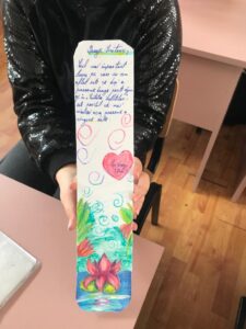 Împreună am ajuns la concluzia că lectura ne înfrumusețează viața și că putem trăi sute de vieți cu fiecare erou pe care îl întâlnim în cărți!  Viața se îmbogățește cu fiecare pagină pe care o citim. Elevii au simțit nevoia să îi ofere ceva din sufletul lor, realizând astfel semne de carte în care și-au exprimat gândurile.